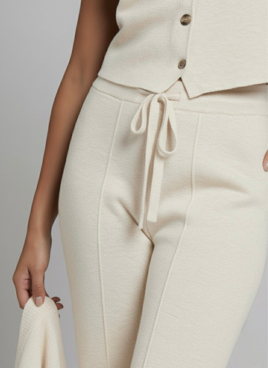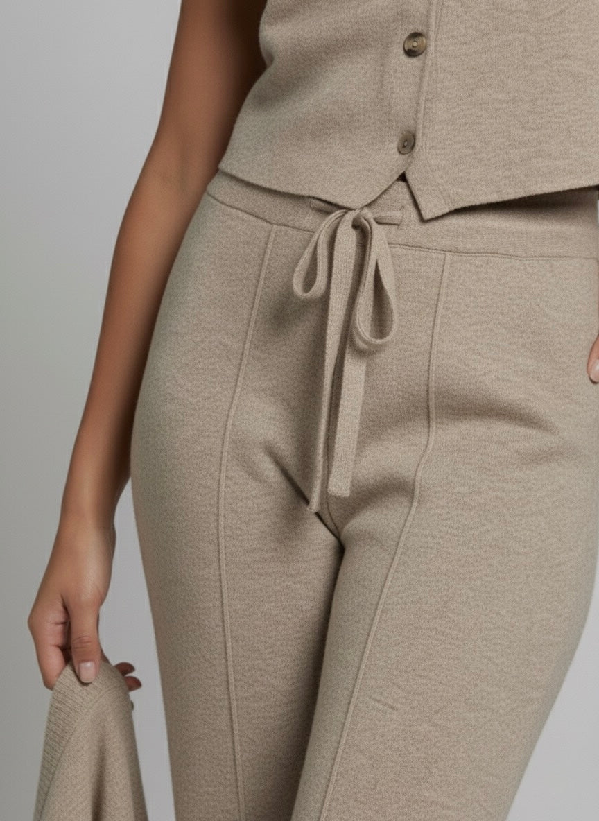– Un pantalon fluide à taille coulissée pour une silhouette décontractée et féminine.